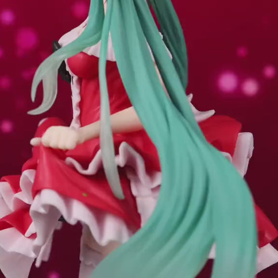 Esta pieza coleccionable destaca por su vestuario detallado tipo Lolita: volantes, lazo grande, falda amplia y acabado rojo vibrante, además de la conocida melena turquesa de Miku.